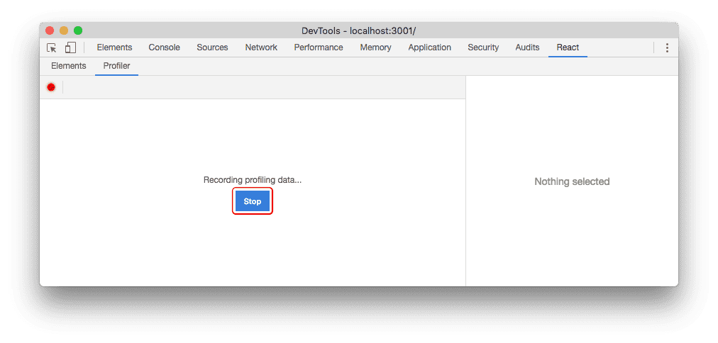 Once you’ve started recording, DevTools will automatically collect performance information each time your application renders. Use your app as you normally would. When you are finished profiling, click the «Stop» button.