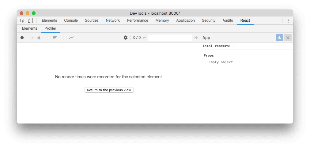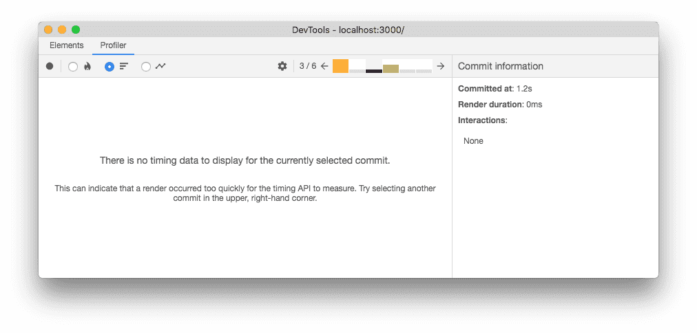 This message indicates that no performance data was recorded for the root that’s selected in the «Elements» panel. In this case, try selecting a different root in that panel to view profiling information for that root: