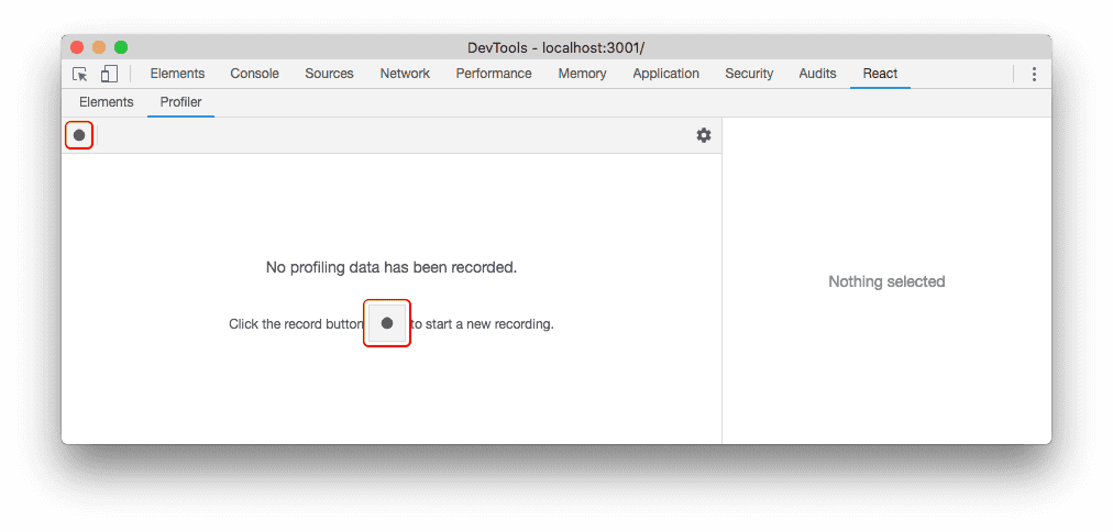The «Profiler» panel will be empty initially. Click the record button to start profiling: