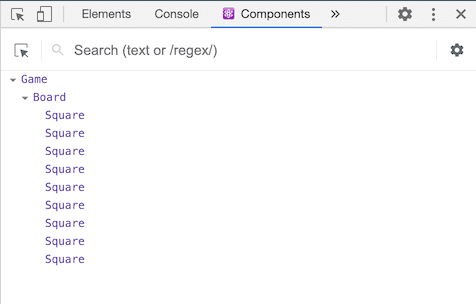 Компонент Board рендерит 9 компонентов Square, каждый из которых рендерит по одному элементу <button>. Компонент Game рендерит поле c заглушками, которые мы изменим позже. Пока у нас нет ни одного интерактивного компонента.